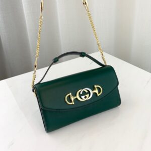 Introduced in the evocative setting of the Theatre Le Palace in Paris. the Gucci Zumi line takes its name from actress and experimental musician Zumi Rosow. who walked the Spring Summer 2019 runway carrying the bag. Gucci continues to bring House icons to the forefront in unexpected ways. merging two of its most distinctive codes into one symbol: the Interlocking G Horsebit. The hardware is presented in a modern mix of silver and gold tones on a smooth leather mini shoulder bag. The bag can be carried cross body. used as a clutch when the chain is removed and worn as a top handle when the leather handle is extended.