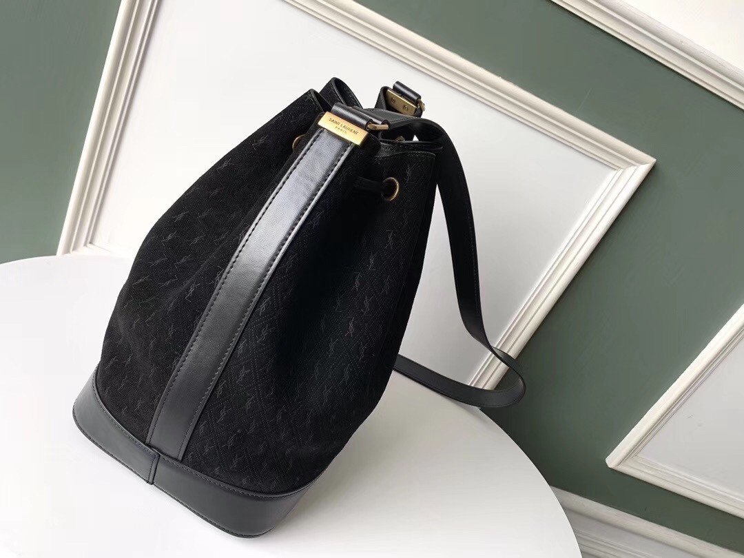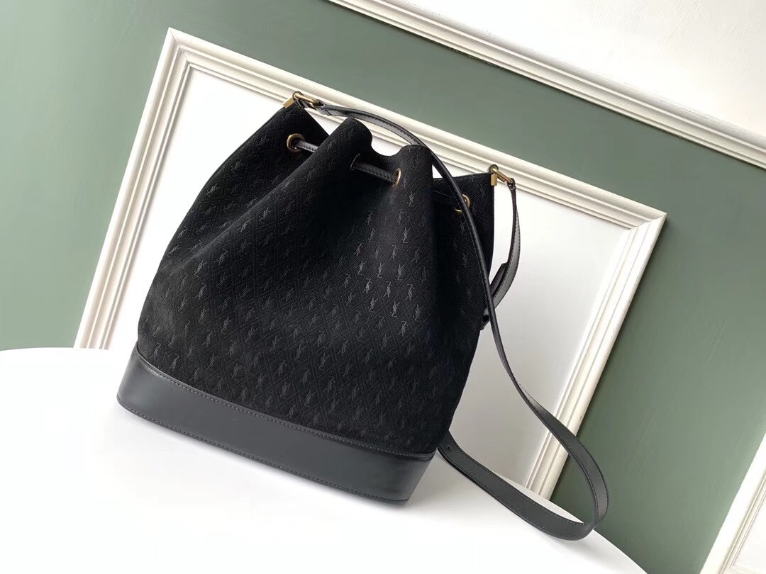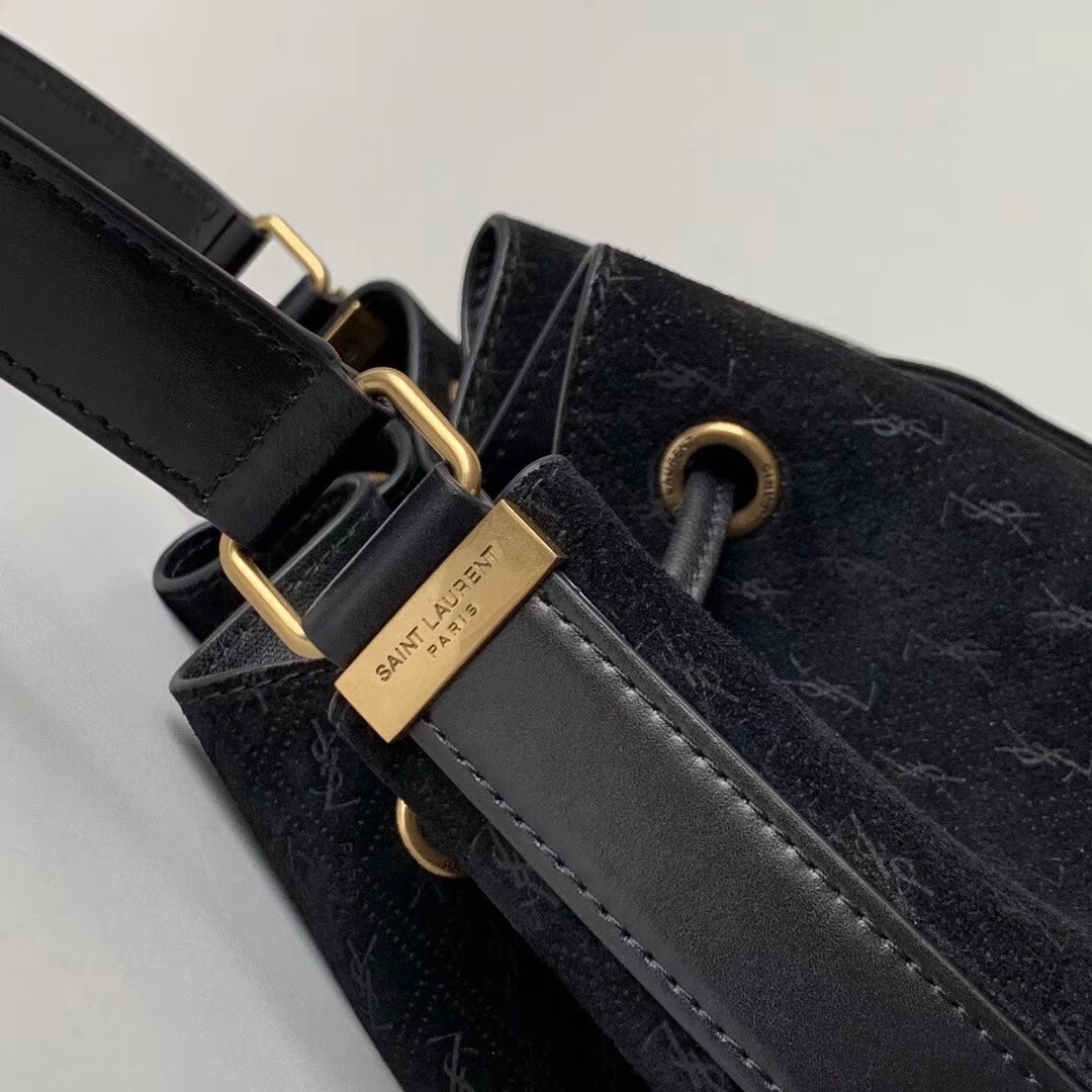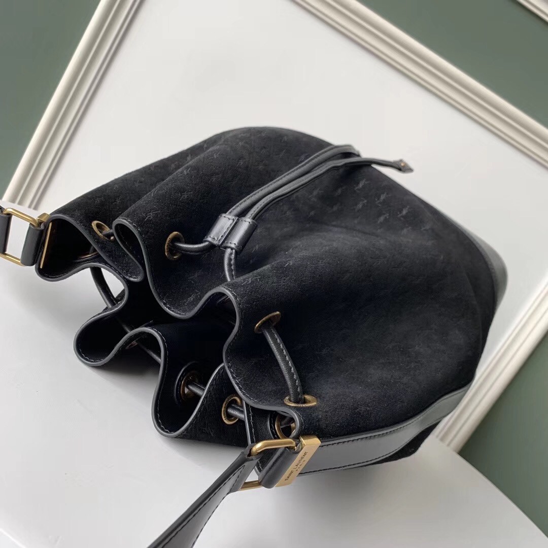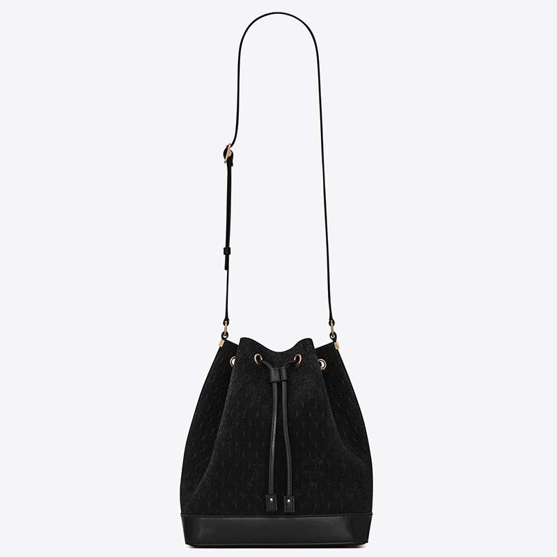 Saint Laurent Monogram All Over Bucket Bag In Black Suede
