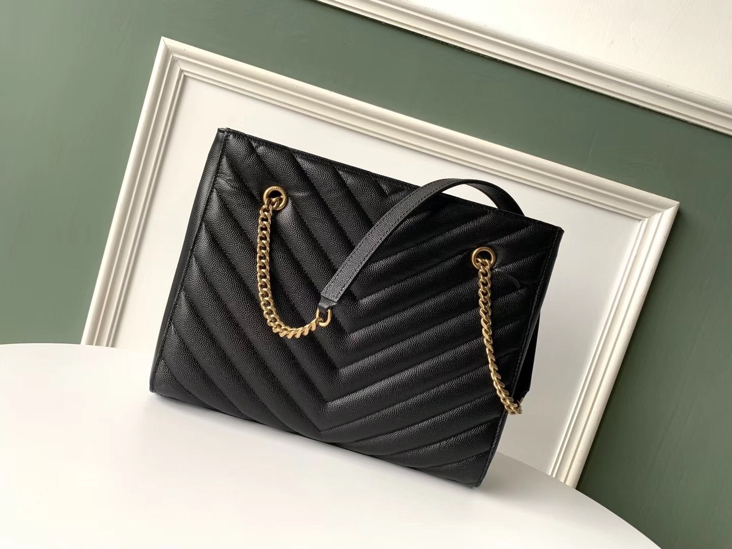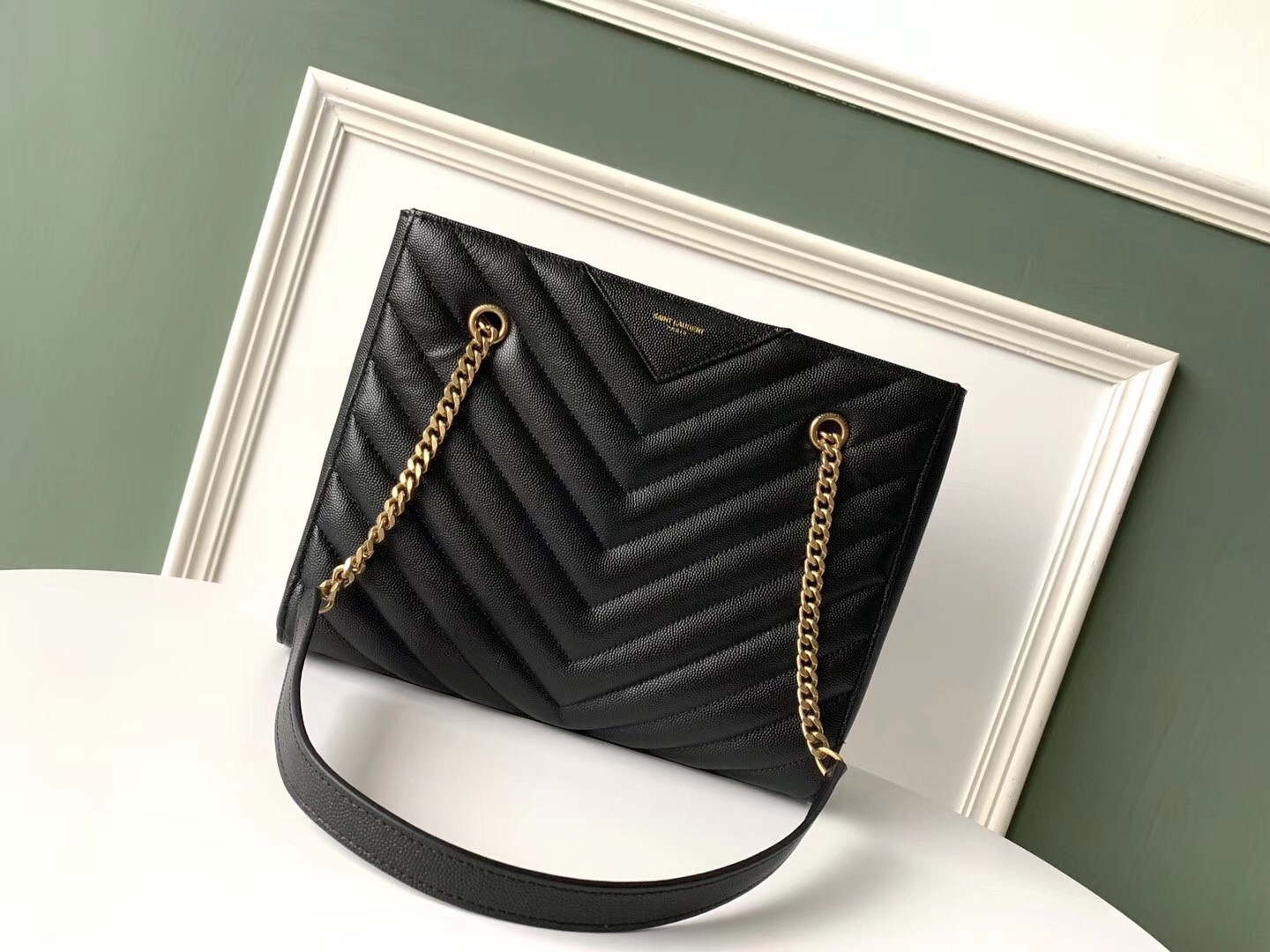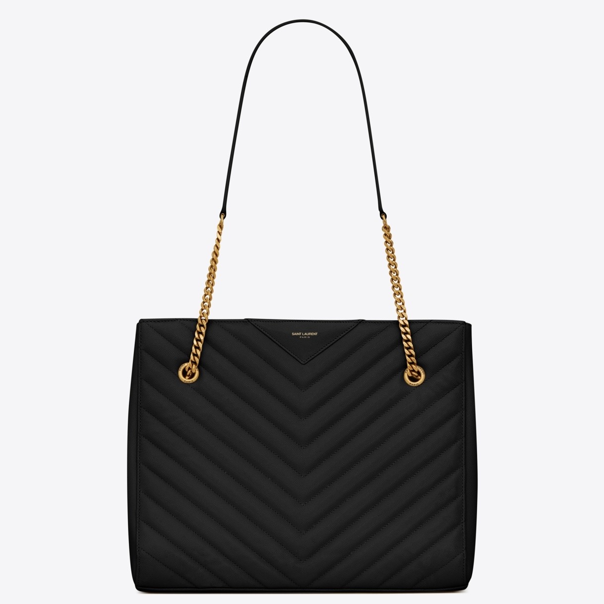 – Leather-reinforced chain handles with 29 cm drop
